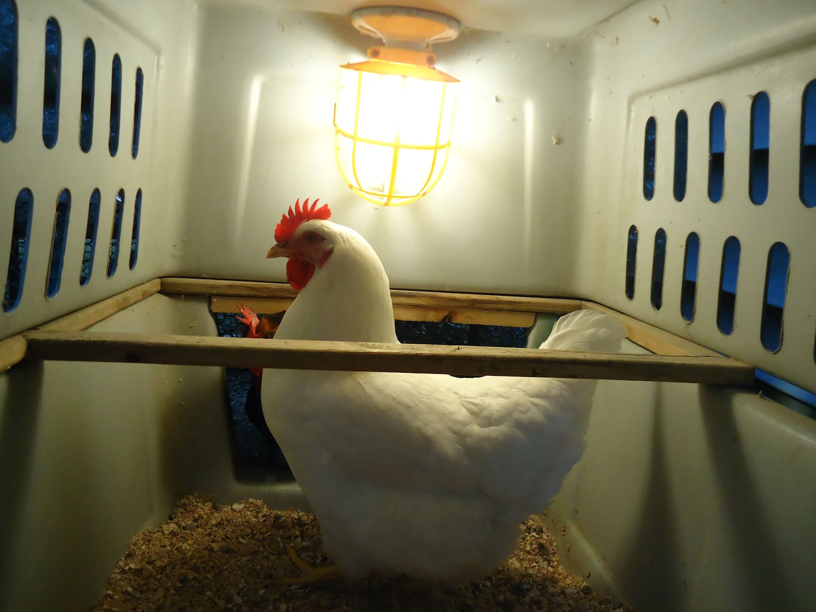 Their "Coop" is a modified dog crate. They have a light and a roost, but I think I need to add some height before they will use the roost. They lay in the back, right under the egg door.